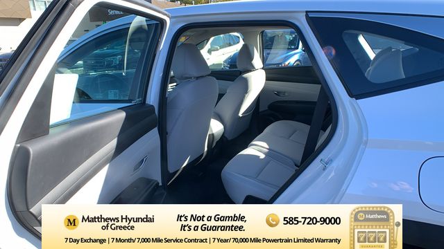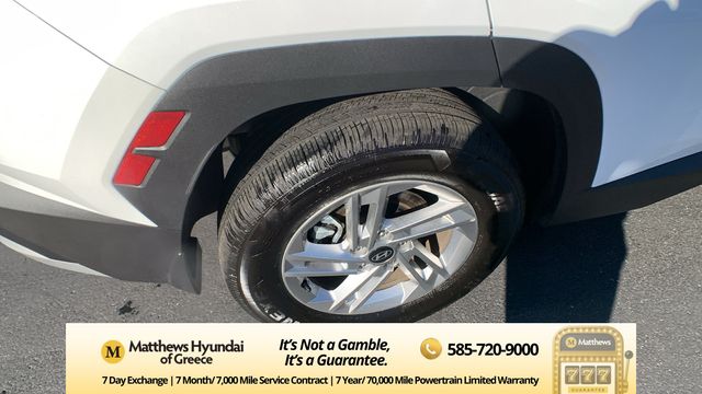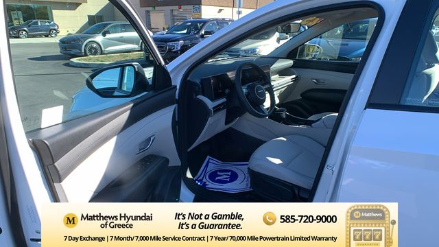 Serenity White Pearl 2025 Hyundai Tucson SE AWD 8-Speed Automatic with SHIFTRONIC 2.5L I4 DGI DOHC 16V LEV3-SULEV30 187hp AWD, 17" Alloy Wheels, 4-Wheel Disc Brakes, 6 Speakers, ABS brakes, Air Conditioning, Alloy wheels, AM/FM radio: SiriusXM, Apple CarPlay & Android Auto, Auto High-beam Headlights, Brake assist, Bumpers: body-color, Cargo Tray, Carpeted Floor Mats, Delay-off headlights, Driver door bin, Driver vanity mirror, Dual front impact airbags, Dual front side impact airbags, Electronic Stability Control, Emergency communication system: Bluelink+, First Aid Kit, Four wheel independent suspension, Front anti-roll bar, Front Bucket Seats, Front Center Armrest, Front reading lights, Fully automatic headlights, Illuminated entry, Low tire pressure warning, Mud Guards, Occupant sensing airbag, Option Group 01, Outside temperature display, Overhead airbag, Overhead console, Panic alarm, Passenger door bin, Passenger vanity mirror, Power door mirrors, Power steering, Power windows, Radio data system, Radio: AM/FM/HD Audio System, Rear anti-roll bar, Rear reading lights, Rear seat center armrest, Rear side impact airbag, Rear window defroster, Rear window wiper, Remote keyless entry, Security system, Speed control, Split folding rear seat, Spoiler, Stain & Odor Resistant Cloth Seat Trim, Steering wheel mounted audio controls, Tachometer, Telescoping steering wheel, Tilt steering wheel, Traction control, Trip computer, Variably intermittent wipers, Wheel Locks.
