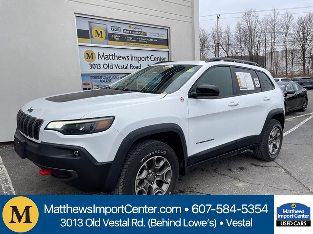 Matthews Import Center promises each customer a thorough and confident 120-point inspection on our used inventory guaranteeing a relaxing and peace-of-mind experience. We are located behind Lowes in Vestal NY. Or call us at (607) 729 - 6261Matthews Import Center3013 Old Vestal RoadVestal NY 13850. Bright White Clearcoat 2022 Jeep Trailhawk Cherokee 4WD 9-Speed 948TE Automatic 3.2L V6Recent Arrival!