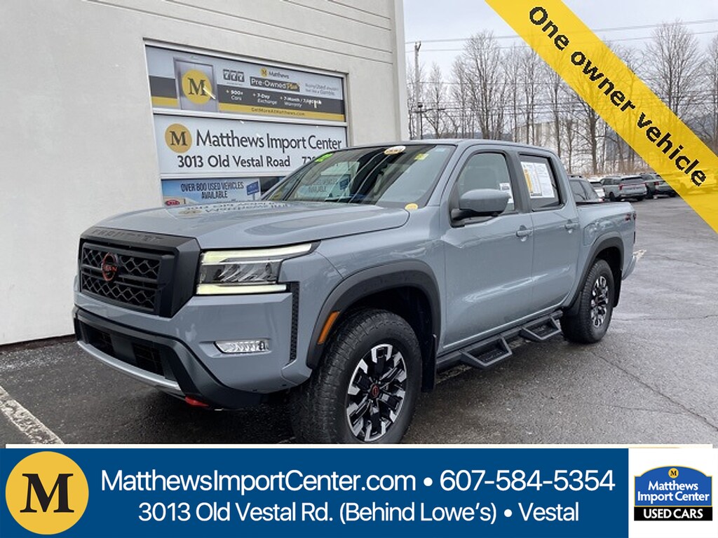 Matthews Import Center promises each customer a thorough and confident 120-point inspection on our used inventory guaranteeing a relaxing and peace-of-mind experience. We are located behind Lowes in Vestal NY. Or call us at (607) 729 - 6261Matthews Import Center3013 Old Vestal RoadVestal NY 13850. Boulder Gray Pearl 2022 Nissan PRO-4X Frontier 4WD 9-Speed Automatic 3.8L DI DOHC 24V V6Odometer is 25068 miles below market average!