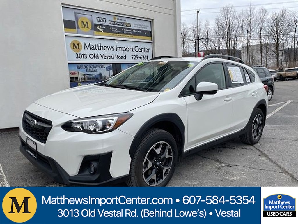 Crystal White Pearl 2019 Subaru Crosstrek 2.0i Premium AWD Lineartronic CVT 2.0L DOHC27/33 City/Highway MPGAwards: * ALG Residual Value Awards Residual Value Awards * 2019 KBB.com 10 Best All-Wheel-Drive Vehicles Under $30000 * 2019 KBB.com 10 Best SUVs Under $30000 * 2019 KBB.com 5-Year Cost to Own Awards * 2019 KBB.com Our 10 Most Awarded Cars of 2019 * 2019 KBB.com Best Resale Value Awards * 2019 KBB.com Brand Image AwardsMatthews Import Center promises each customer a thorough and confident 120-point inspection on our used inventory guaranteeing a relaxing and peace-of-mind experience. We are located behind Lowes in Vestal NY. Or call us at (607) 729 - 6261 Matthews Import Center 3013 Old Vestal Road Vestal NY 13850.Odometer is 69928 miles below market average!